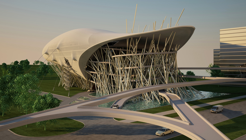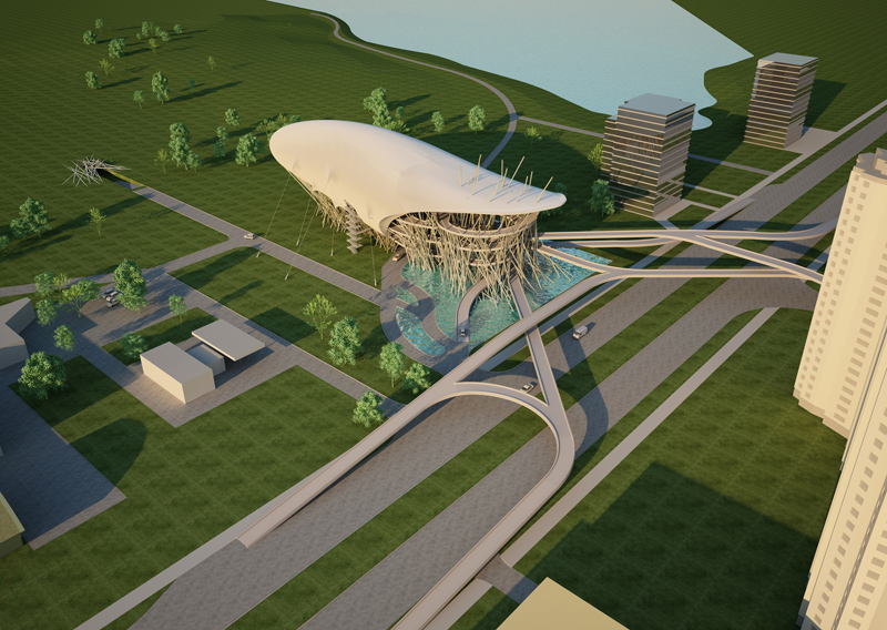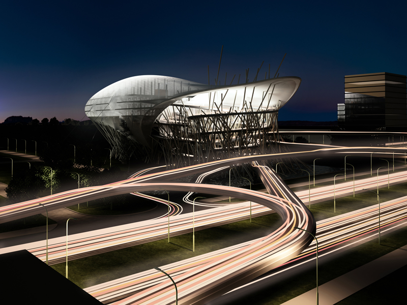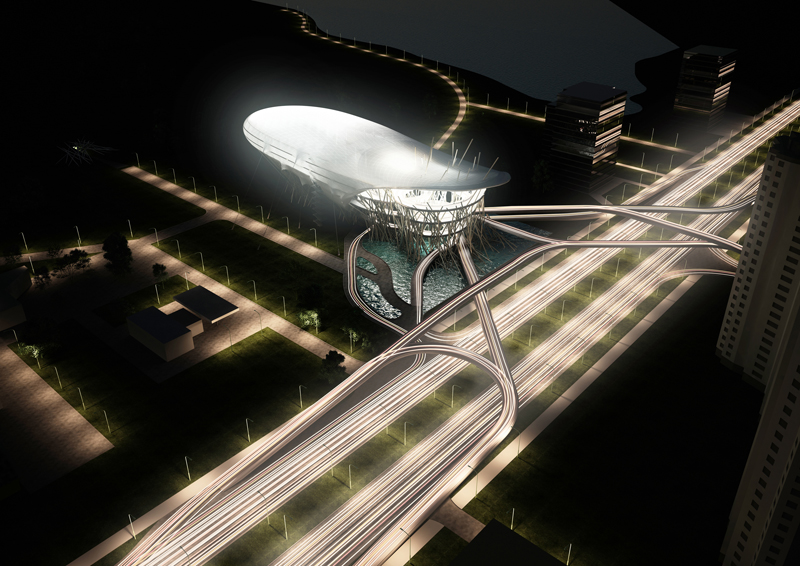 The winner in the SUR exterior category, Arthur Kupreychuk (Kiev, Ukraine), said of his project, A Parking Lot with a Car Service Station, “The second title of the project is ‘The Allegory of Soaring Architecture.’ The project was conceived as the embodiment of the boundless creative thought of an architect, who often must try to restrict it and leave it unfulfilled. Working on my project, I was influenced by the Polish surrealist painter, Zdzislaw Beksiński’s works.”