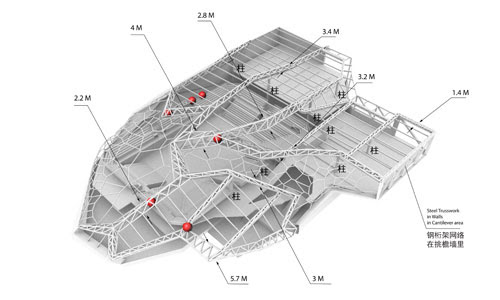 The National Games Arena will be constructed out of reinforced concrete, concrete walls, and steel frame. The long span roof will be made from deep sculptured beams which will be stabilized by interior armatures. These beams will also contain the mechanical systems of the space. The opaque skin of the building will be aluminum panel, featuring thin-film solar technology in roof areas. The transparent areas will be made of ETFE bubbles, which are pressurized with air. This system is extremely lightweight compared to glazing, and therefore requires minimal structure to support it. In order to reduce solar gain in summer and heat-loss in winter, we propose to exchange patches of the transparent ETFE bubbles with translucent bubbles consisting of multiple layers of ETFE insulated with aero gel or other high-performance insulation.